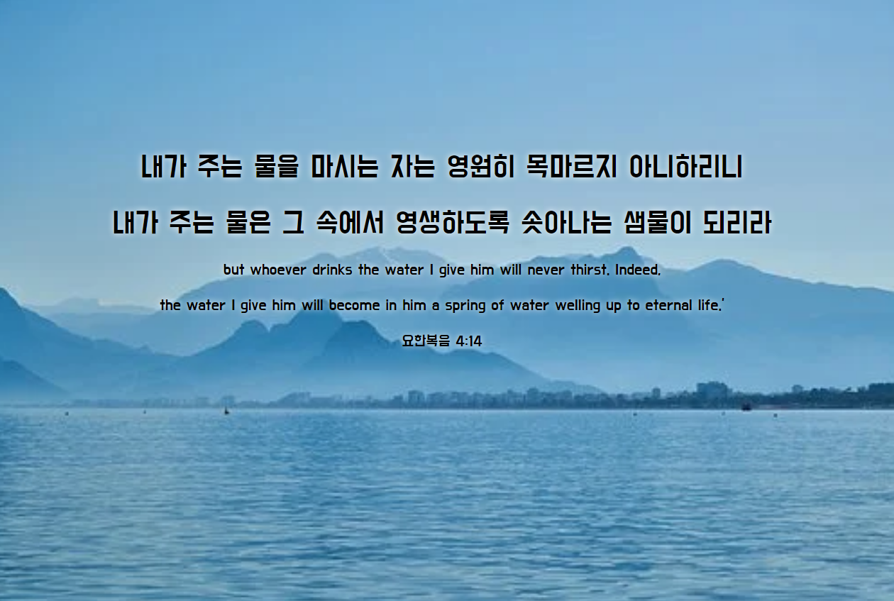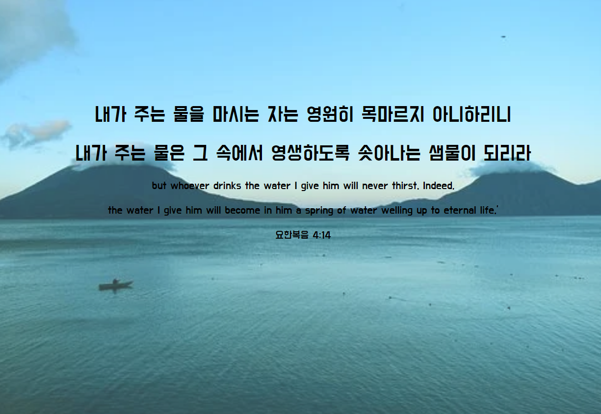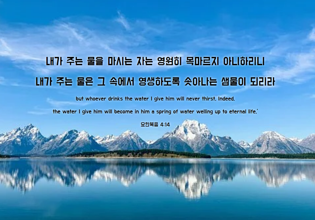 내가 주는 물을 마시는 자는 영원히 목마르지 아니하리니 내가 주는 물은 그 속에서 영생하도록 솟아나는 샘물이 되리라