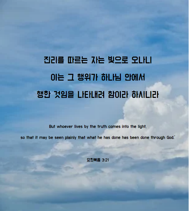 21진리를 따르는 자는 빛으로 오나니 이는 그 행위가 하나님 안에서 행한 것임을 나타내려 함이라 하시니라