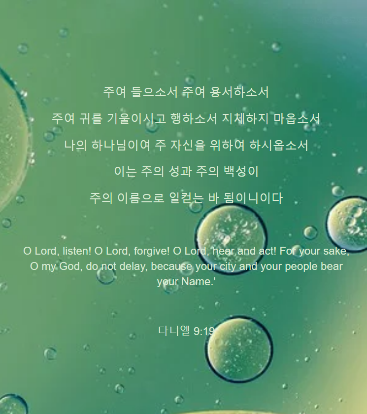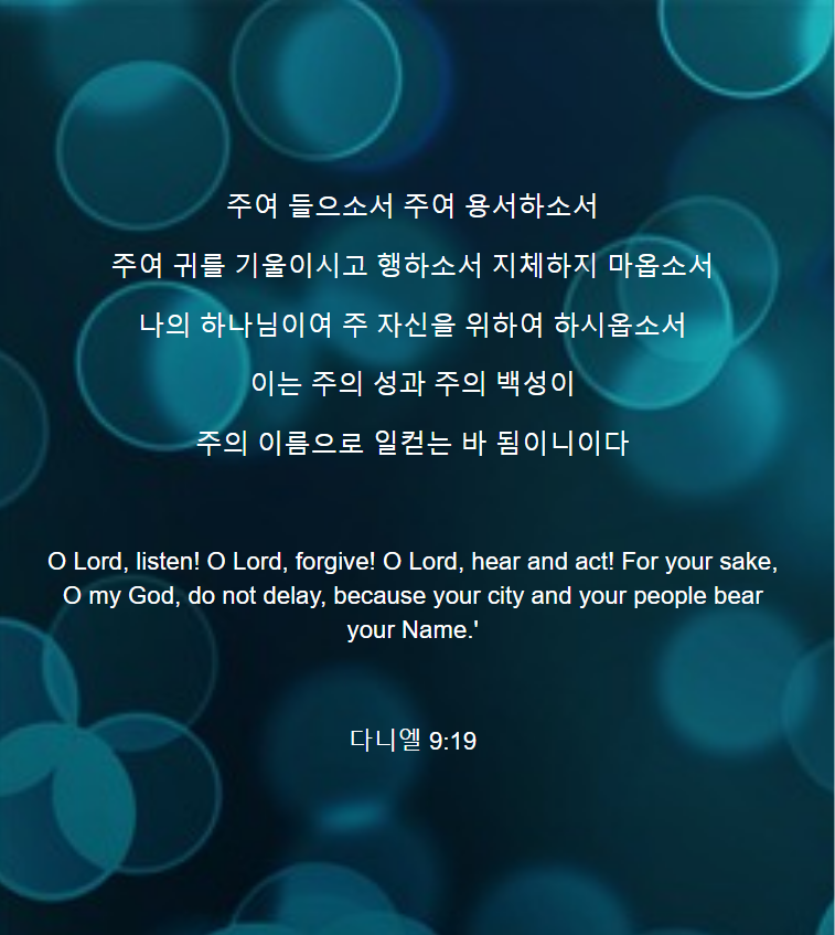 19주여 들으소서 주여 용서하소서 주여 귀를 기울이시고 행하소서 지체하지 마옵소서 나의 하나님이여 주 자신을 위하여 하시옵소서 이는 주의 성과 주의 백성이 주의 이름으로 일컫는 바 됨이니이다