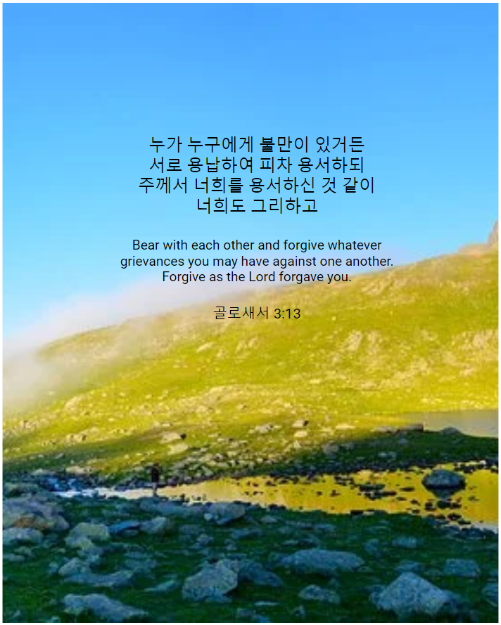 13누가 누구에게 불만이 있거든 서로 용납하여 피차 용서하되 주께서 너희를 용서하신 것 같이 너희도 그리하고