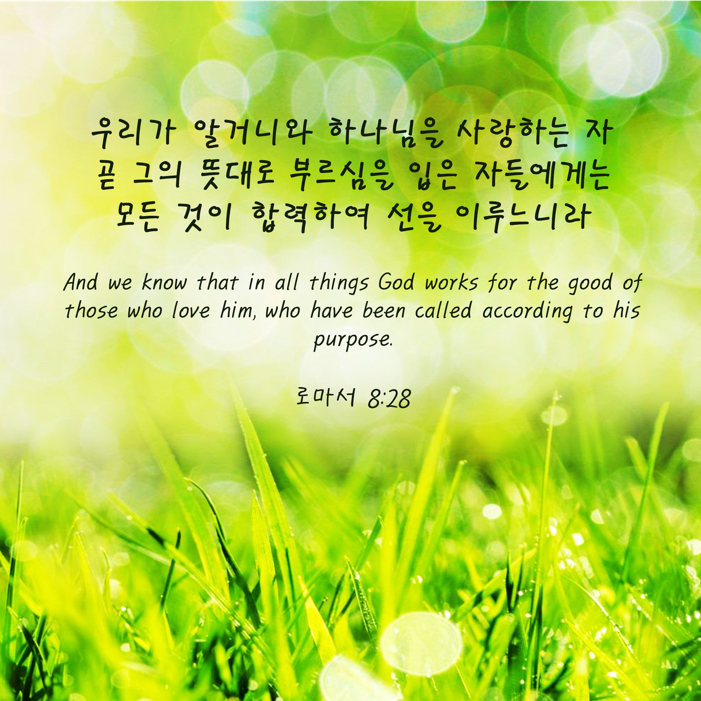 28우리가 알거니와 하나님을 사랑하는 자 곧 그의 뜻대로 부르심을 입은 자들에게는 모든 것이 합력하여 선을 이루느니라