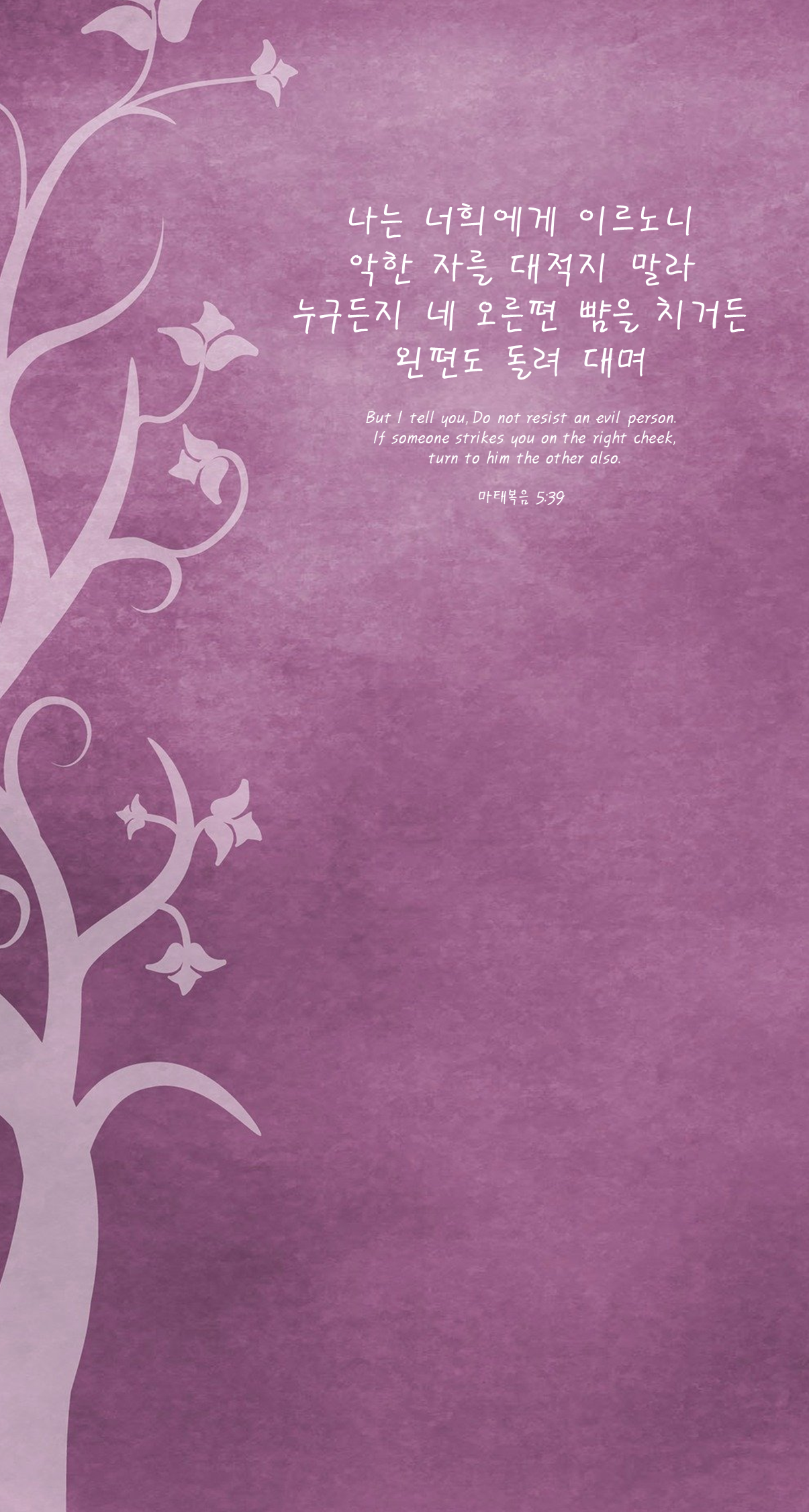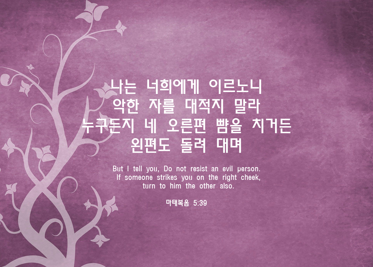 나는 너희에게 이르노니 악한 자를 대적지 말라 누구든지 네 오른편 뺨을 치거든 왼편도 돌려 대며