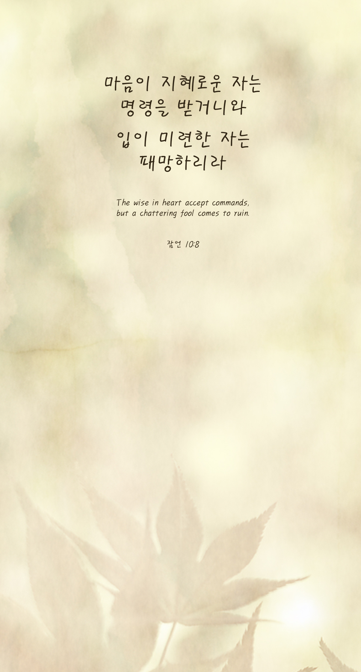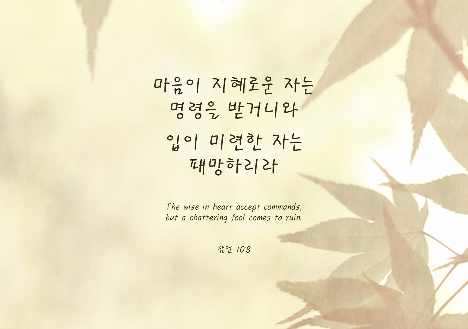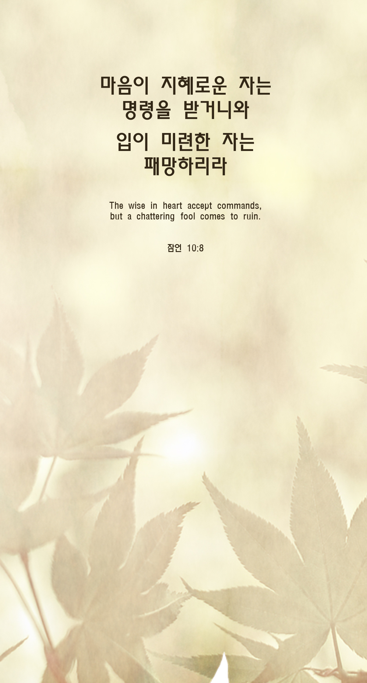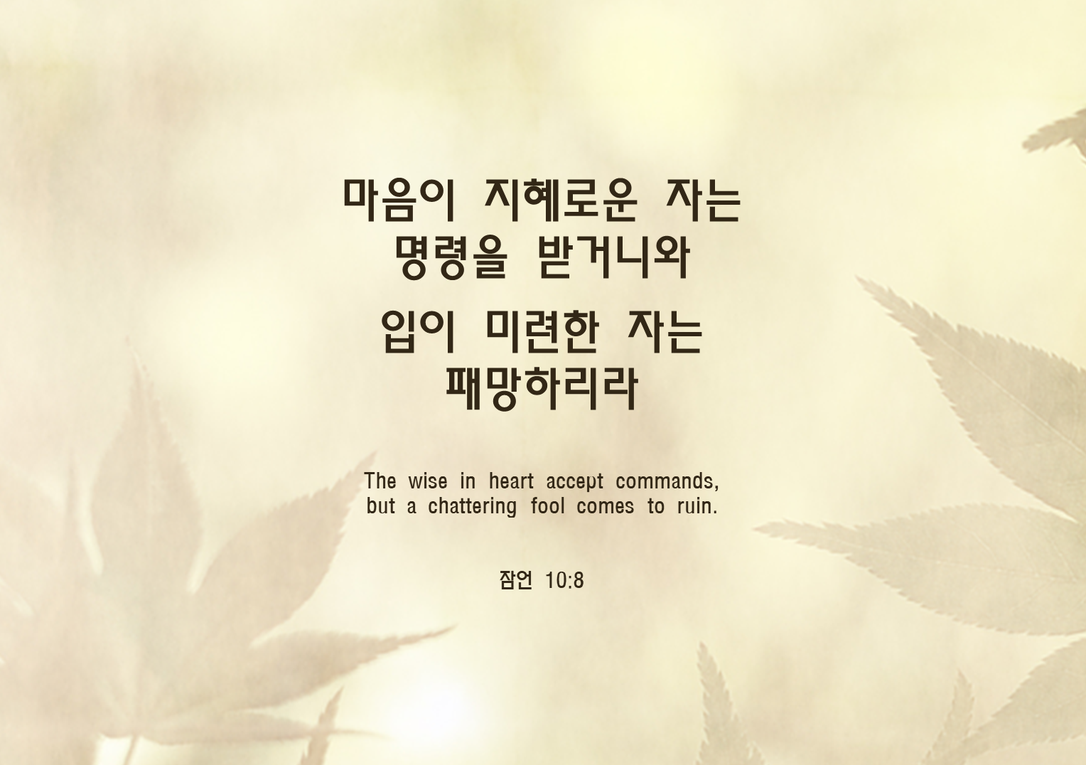 8마음이 지혜로운 자는 명령을 받거니와 입이 미련한 자는 패망하리라