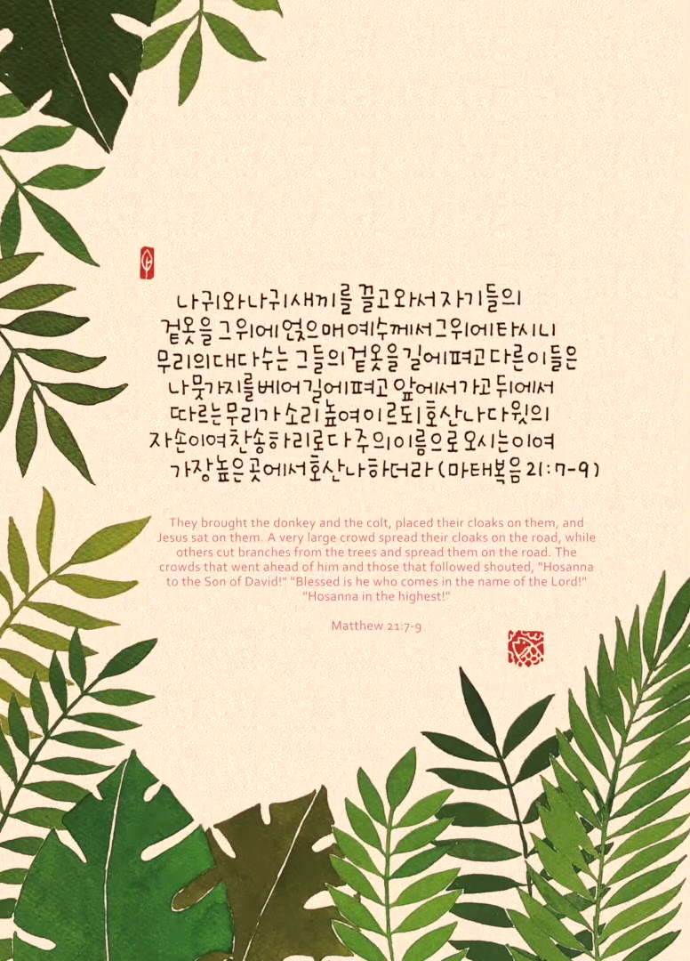 9 앞에서 가고 뒤에서 따르는 무리가 소리 높여 이르되 호산나 다윗의 자손이여 찬송하리로다 주의 이름으로 오시는 이여 가장 높은 곳에서 호산나 하더라